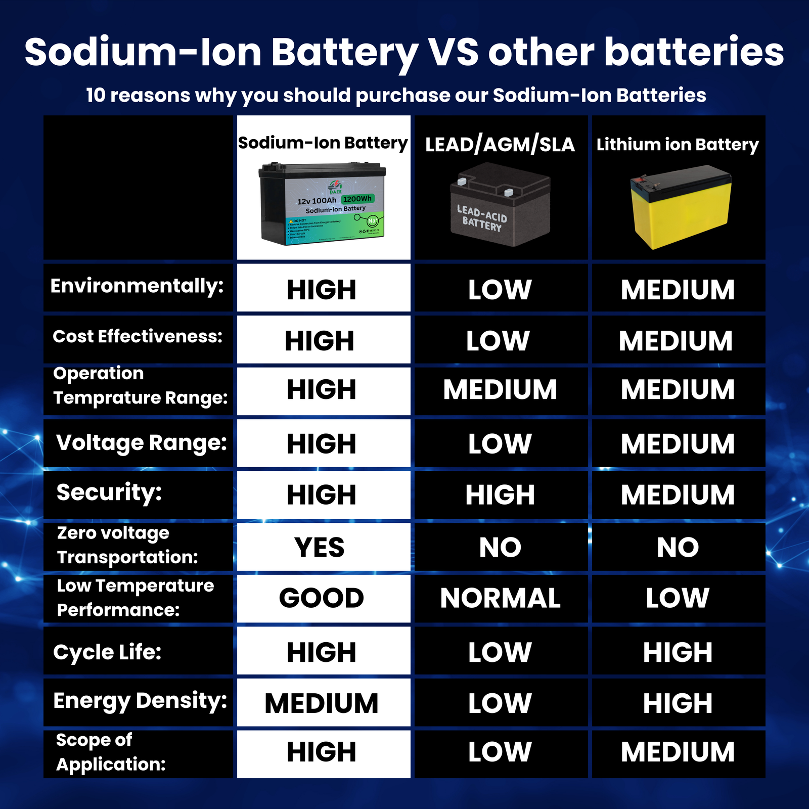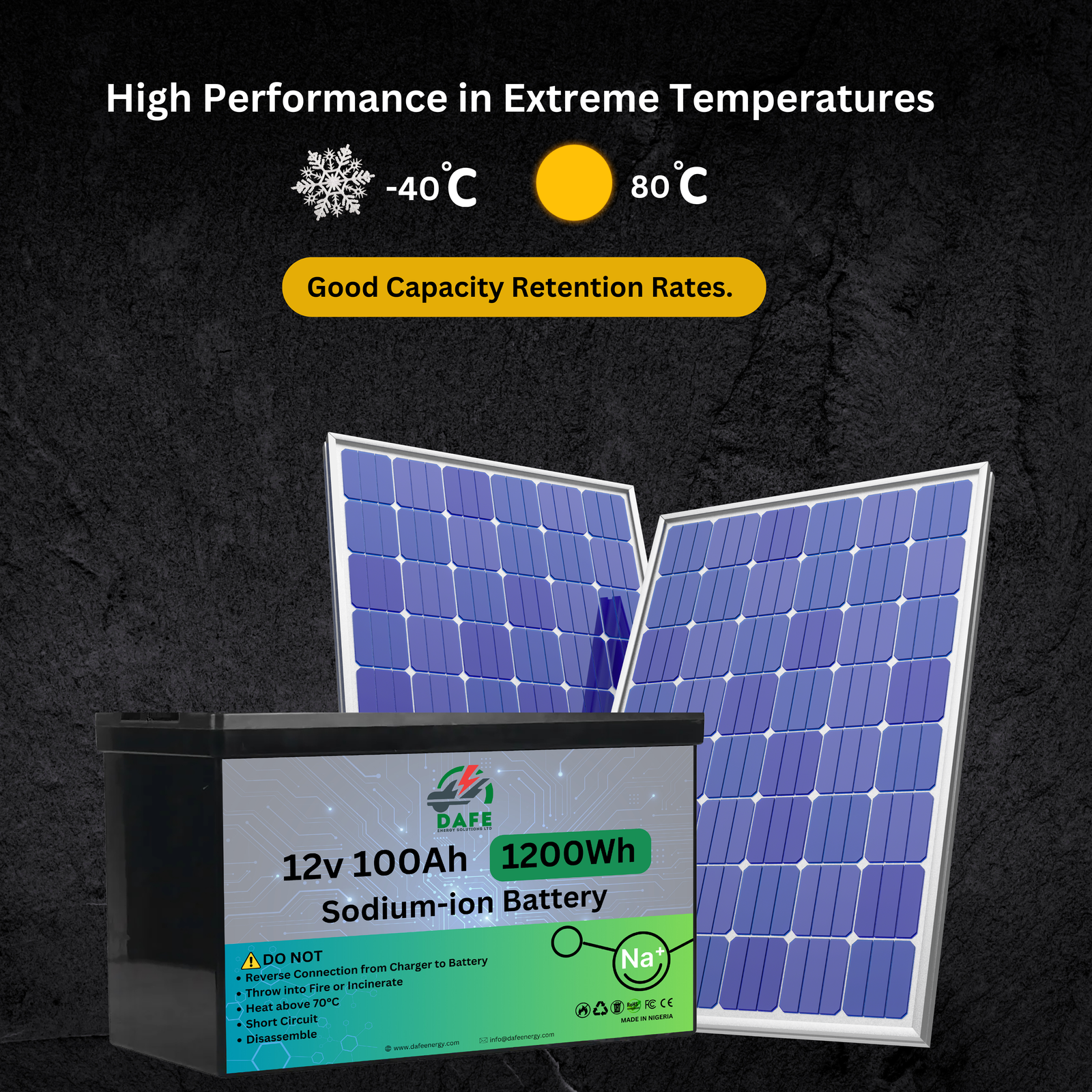 - Stable Performance: Whether in extreme heat or freezing cold, our sodium-ion battery maintains consistent performance, ensuring reliable power in any environment.