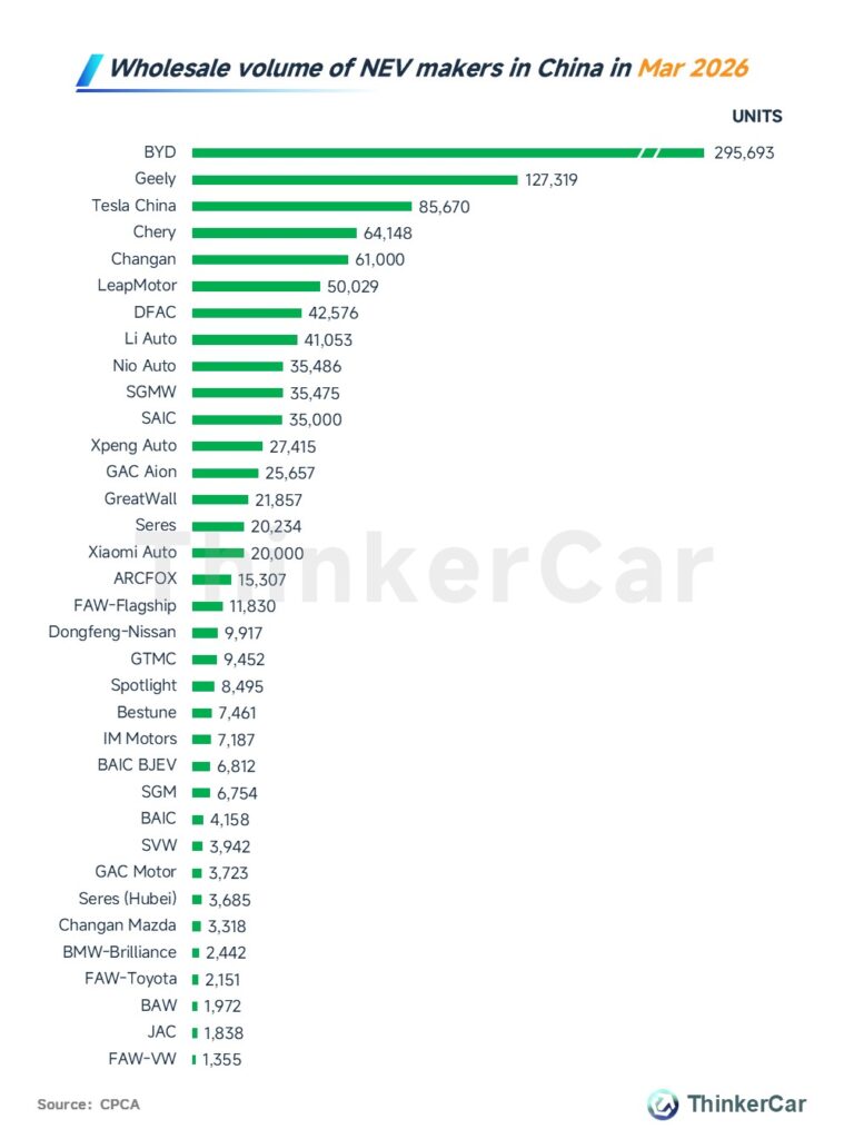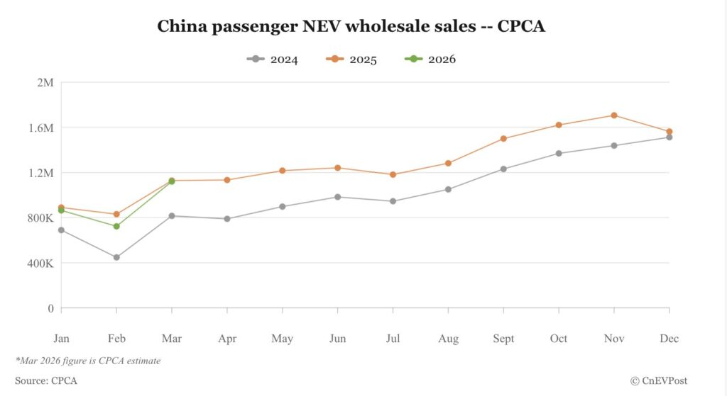 CPCA estimated China’s passenger NEV wholesale sales reached 1.12 million units in March, with BYD topping all automakers and Tesla ranking third.