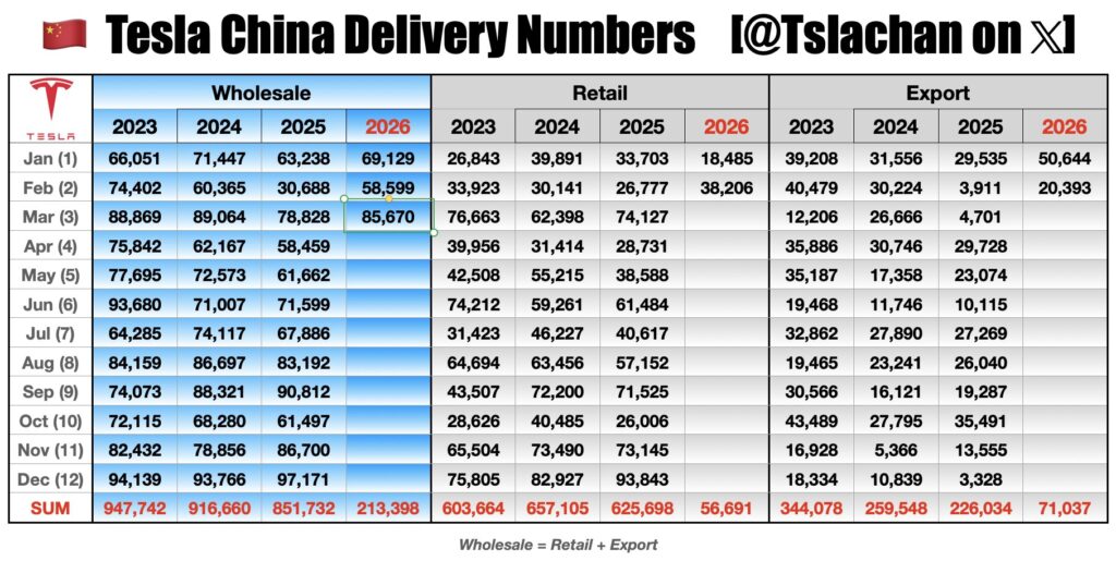 Tesla China Mar wholesale deliveries jump as market recovers. Tesla China’s wholesale volume reached 85,670 vehicles in March, representing a 46.20% increase from the previous month